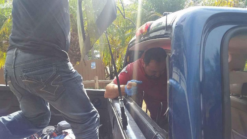 With the glass removed, excess urethane glue is removed from the body of the truck.